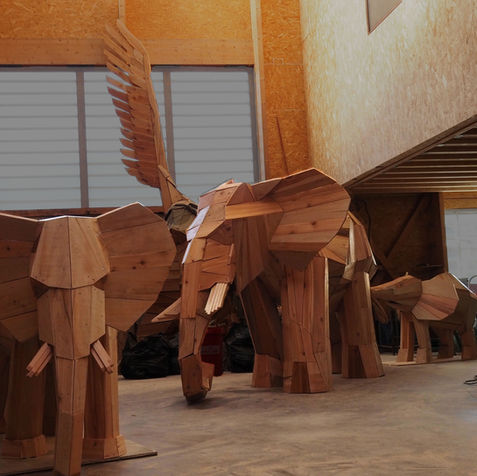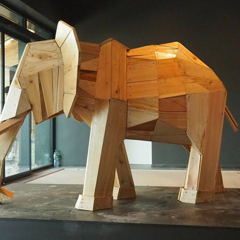 Nous pouvons la catégoriser ; sculpture d’éléphant en planches de bois ou sculpture construite.